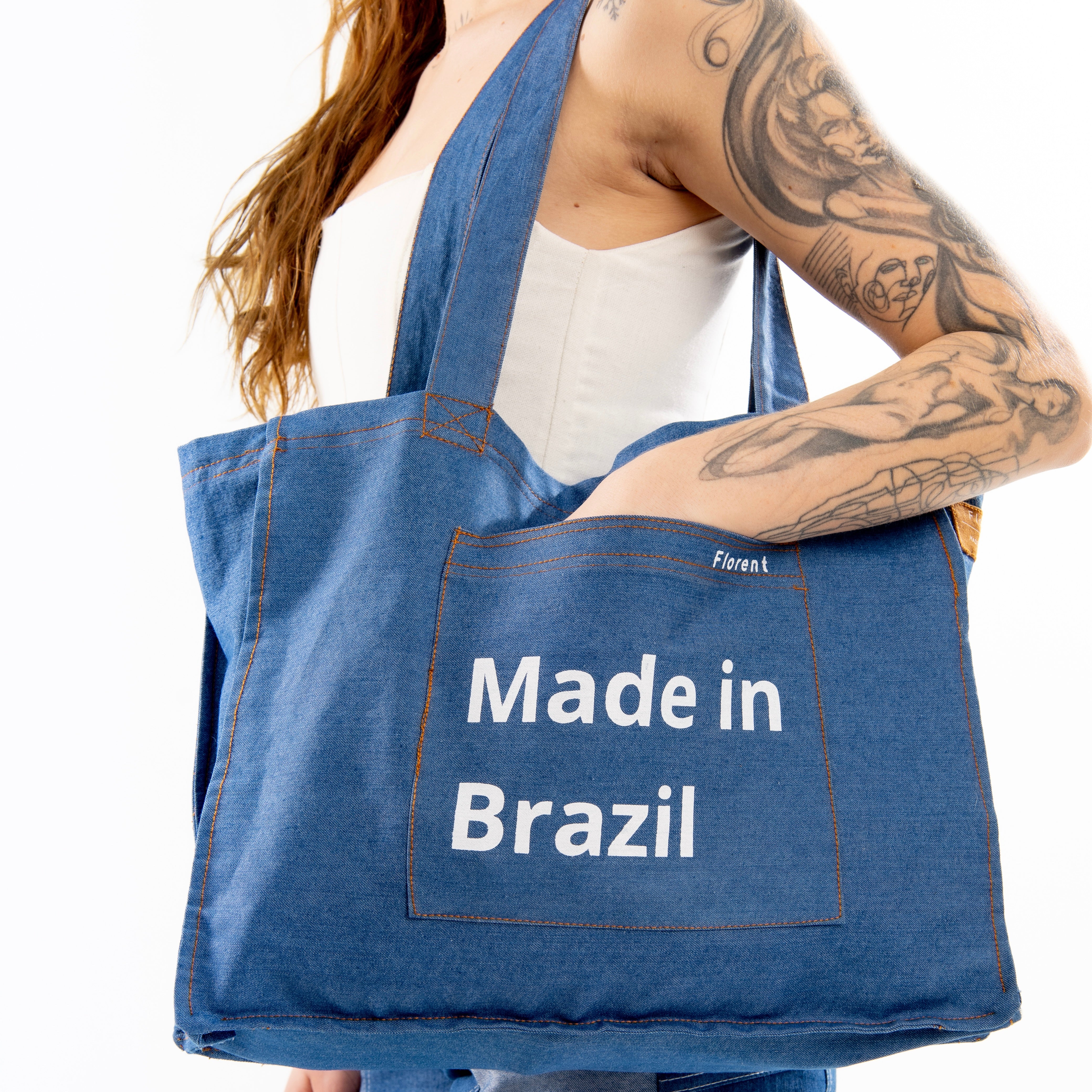 Com design funcional, a Ecobag Jeans "Made in Brazil" é a combinação perfeita entre estilo urbano e consciência nacional. A estampa "Made in Brazil" é um convite ao orgulho de produzir e consumir de forma local e responsável. Seu tamanho generoso (50cm x 10cm x 40cm) comporta tudo o que você precisa para o dia a dia, com praticidade e beleza.